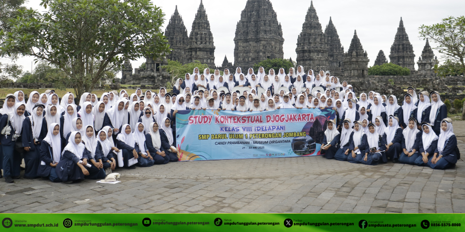 Jombang – Dalam upaya memperkaya wawasan siswa melalui pembelajaran di luar kelas, SMP DARUL ULUM 1 UNGGULAN PETERONGAN mengadakan kegiatan studi kontekstual ke Yogyakarta yang melibatkan seluruh siswa kelas 8. Kegiatan ini dilaksanakan dalam dua gelombang, yakni tanggal 21 Mei 2025 untuk siswi dan 22 Mei 2025 untuk siswa putra.
